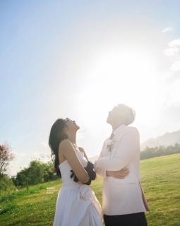 外景,婚纱照,客片,氛围,夕阳,白裙,鲜花,头纱,浪漫,草坪,森系
